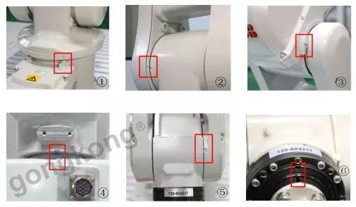 IRB 120 機器人本體的6個軸均有零點標記,如下圖所示。手動將機器人各軸零點標記對準,記錄當前轉數計數器數據,控制器內部將自動計算出該軸的零點位置,并以此作為各軸的基準進行控制。